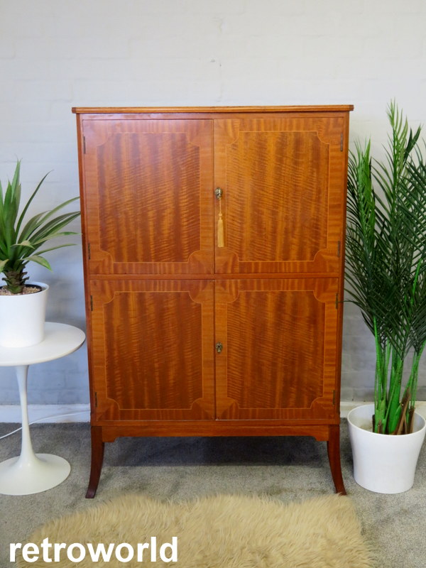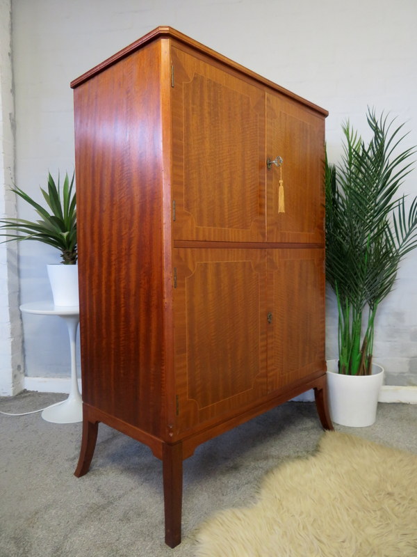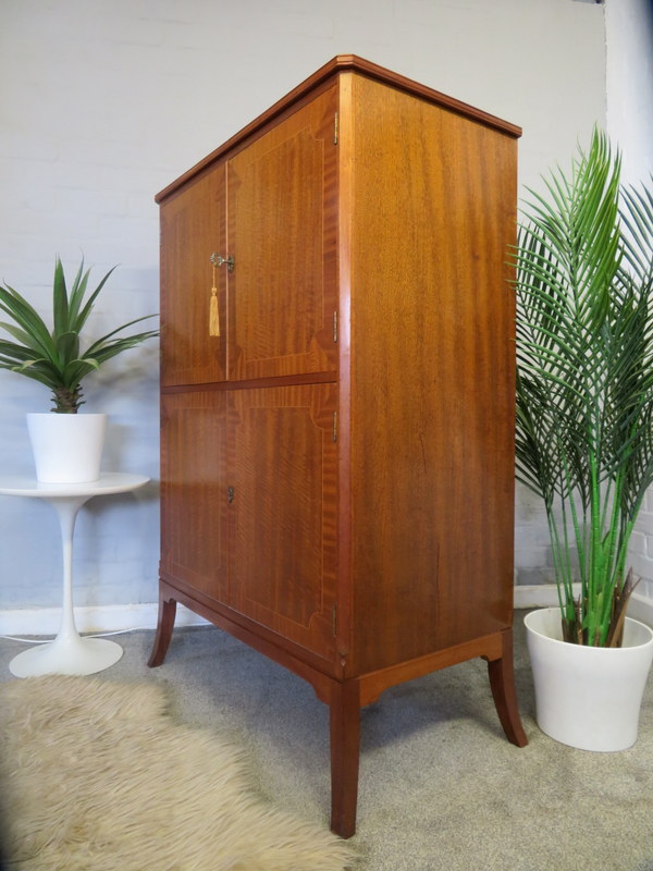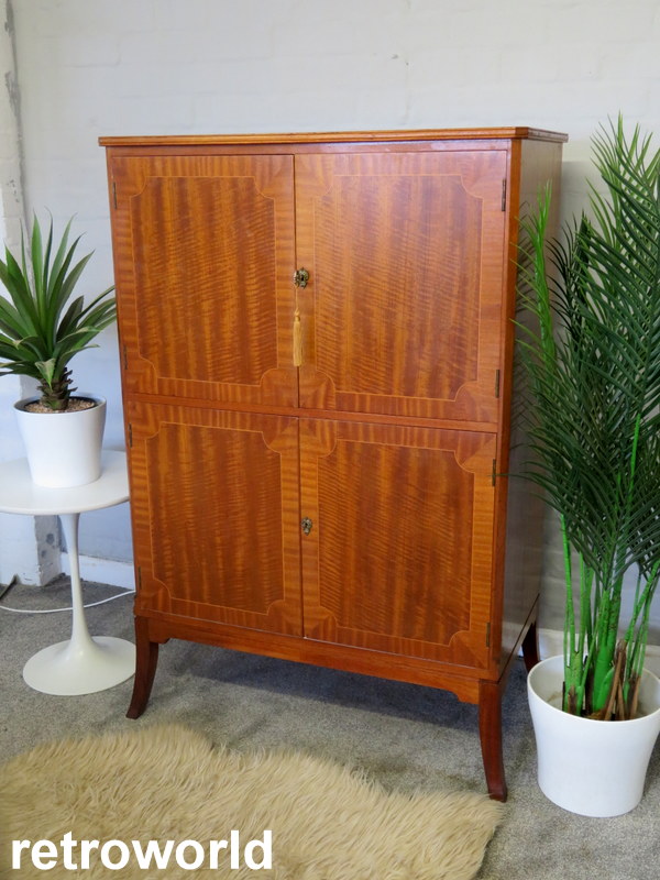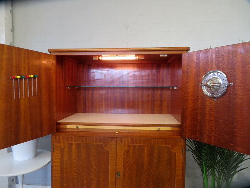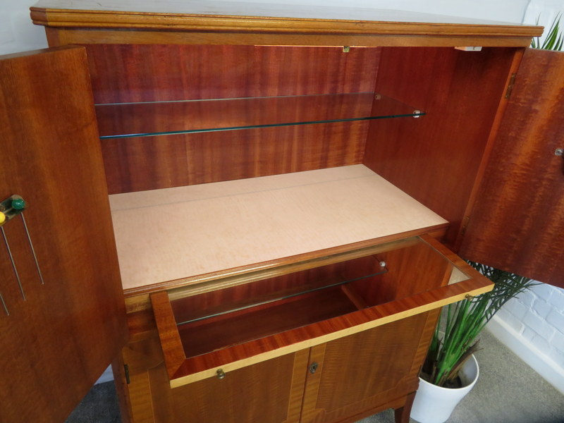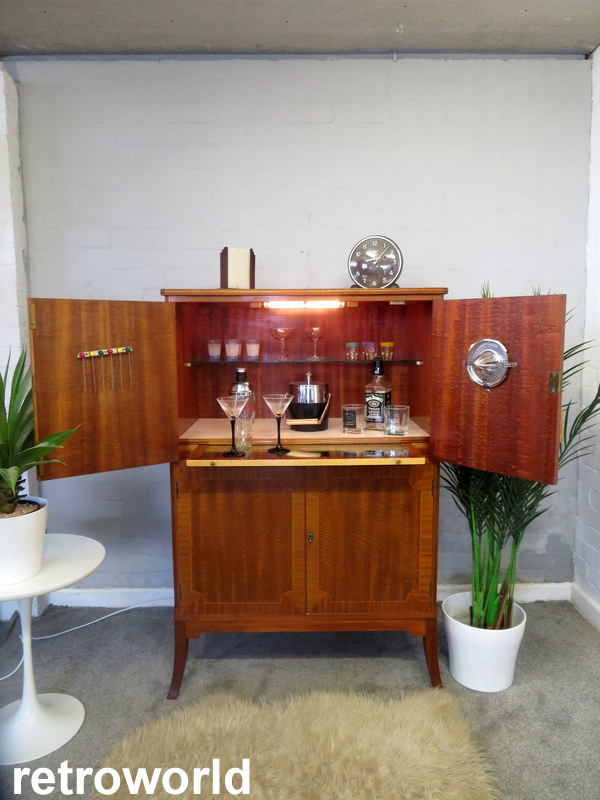 Cocktail Drinks Cabinet that would look lovely in a Vintage Home. The Cabinet features a VERY COOL illuminated top Cocktail section. Open the top right hand door and the interior light automatically turns on. Once both doors at the top are opened you can see the original internal glass shelf, the x6 Cocktail Sticks and the Chrome Lemon Squeezer AND the GORGEOUS pull out mirrored serving area. The Cabinet comes with modern wiring & plug*. There is plenty of storage available inside the bottom doors. Both locks are fully working with original key and a lovely Gold tassel.