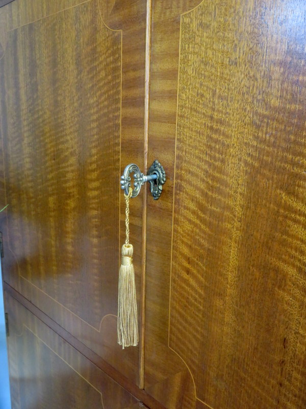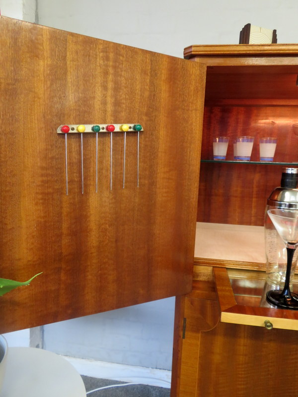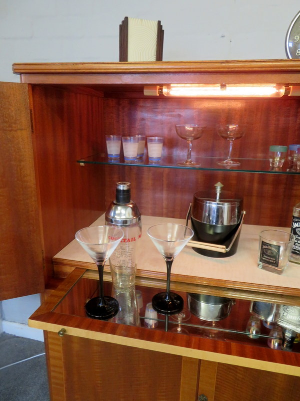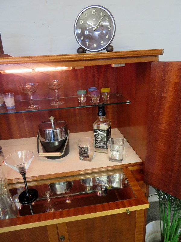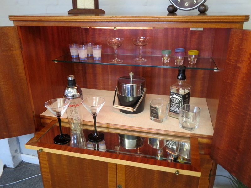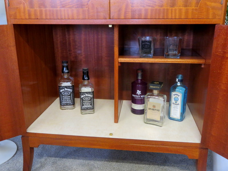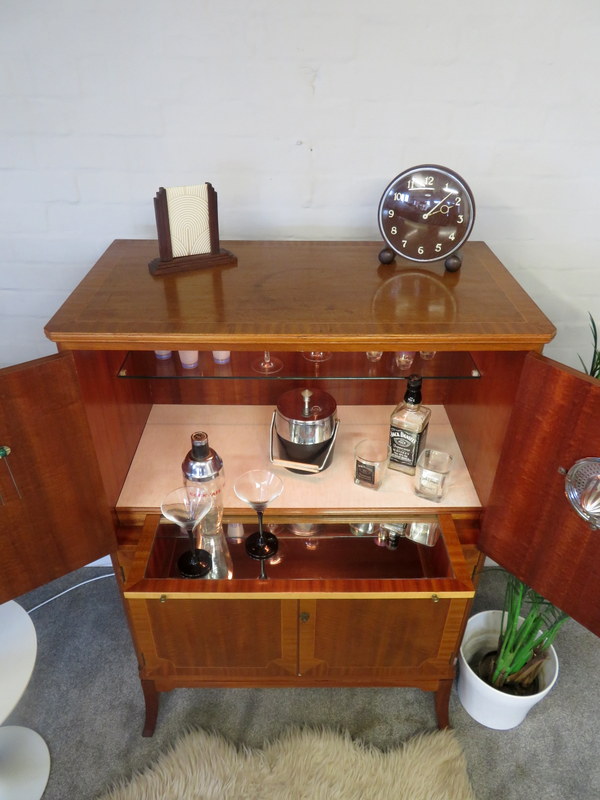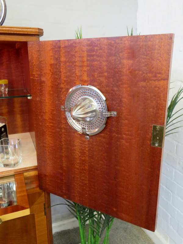 Cocktail Drinks Cabinet that would look lovely in a Vintage Home. The Cabinet features a VERY COOL illuminated top Cocktail section. Open the top right hand door and the interior light automatically turns on. Once both doors at the top are opened you can see the original internal glass shelf, the x6 Cocktail Sticks and the Chrome Lemon Squeezer AND the GORGEOUS pull out mirrored serving area. The Cabinet comes with modern wiring & plug*. There is plenty of storage available inside the bottom doors. Both locks are fully working with original key and a lovely Gold tassel.