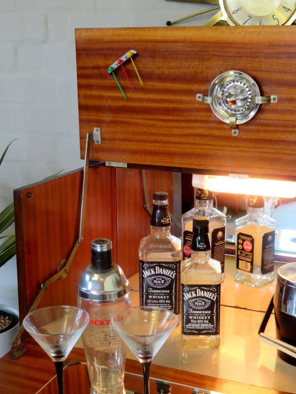 Cocktail Drinks Cabinet made by RIVINGTON of LONDON that would look great in a Vintage Home. The Cabinet features a VERY COOL illuminated top Cocktail section. Pull down the front flap and the top flap lifts and the interior light automatically turns on and reveals the original mirrors, the x6 Original Cocktail Sticks & the Chrome Lemon Squeezer. The Cabinet comes with modern wiring & plug*. There is plenty of storage available inside the doors at the base. The lock is fully working with original key and a lovely Gold tassel.