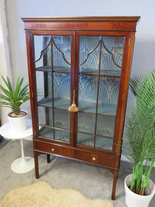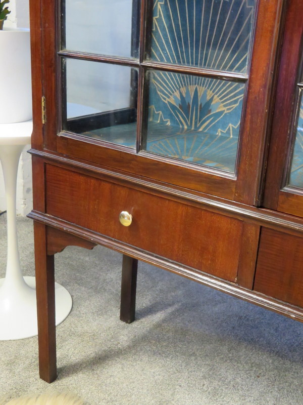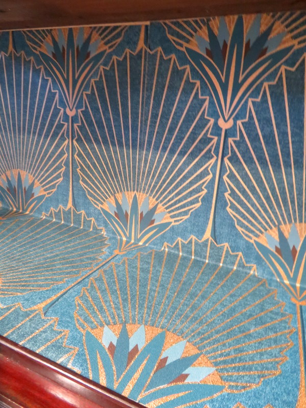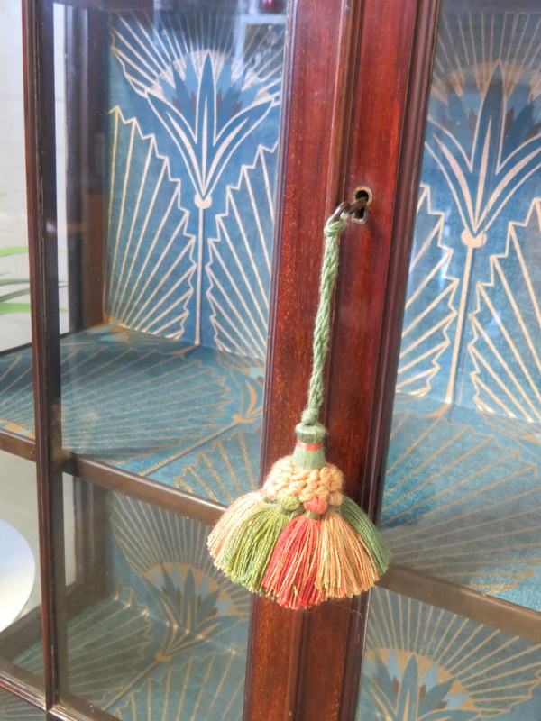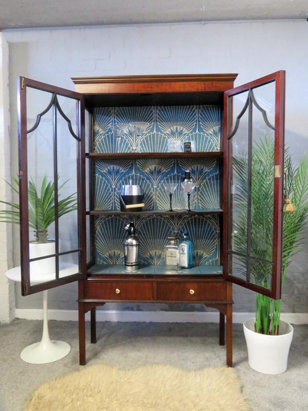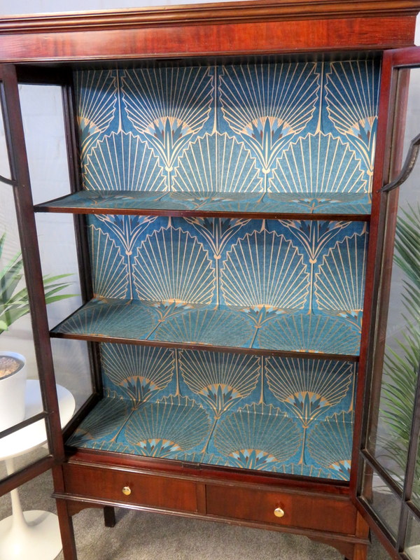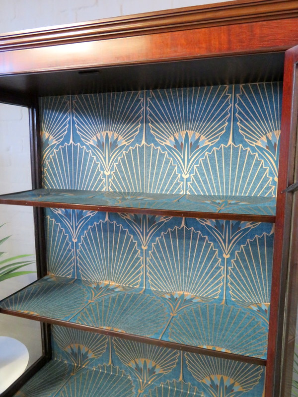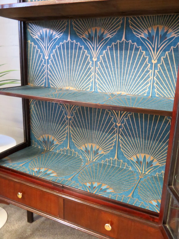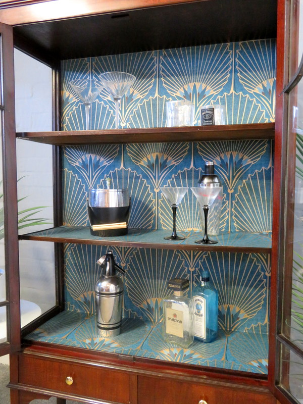 -- The back panel, the shelves and inside bottom section has has had a BEAUTIFUL Art Deco style Wallpaper fitted.