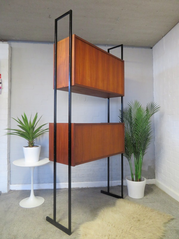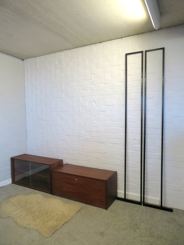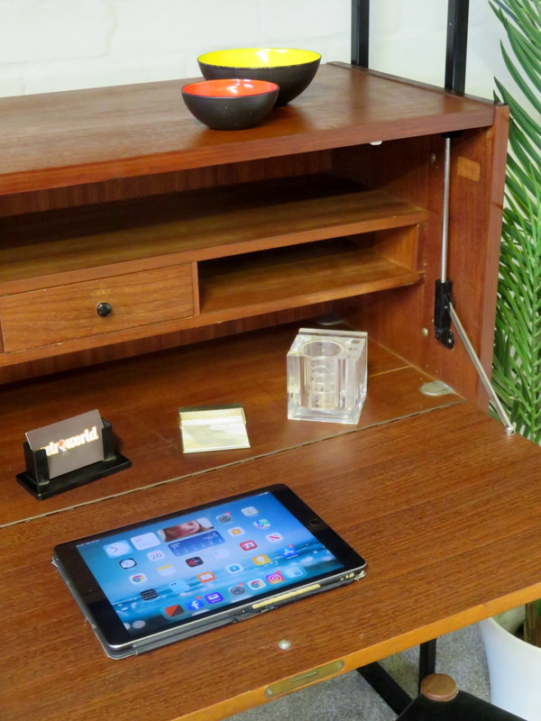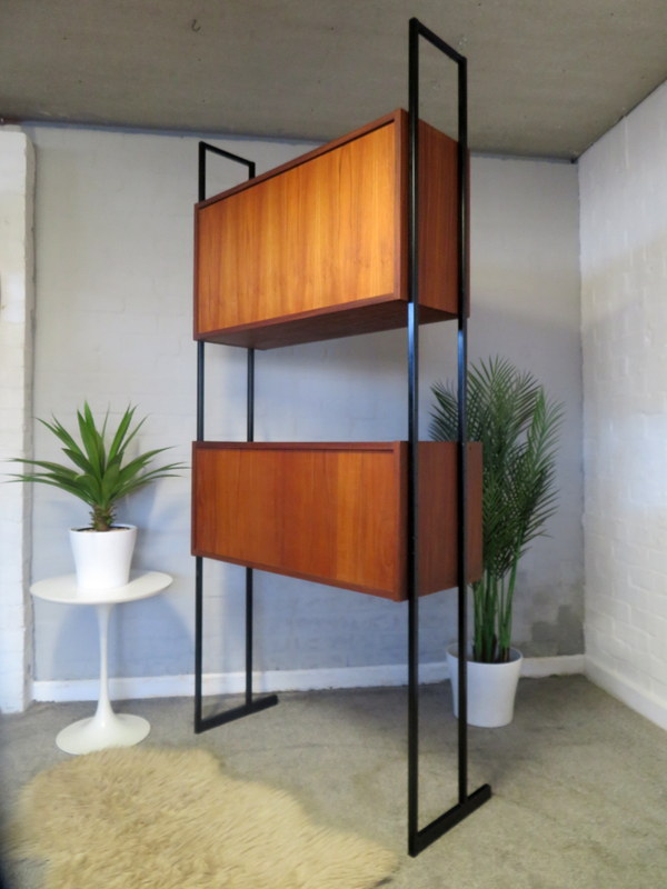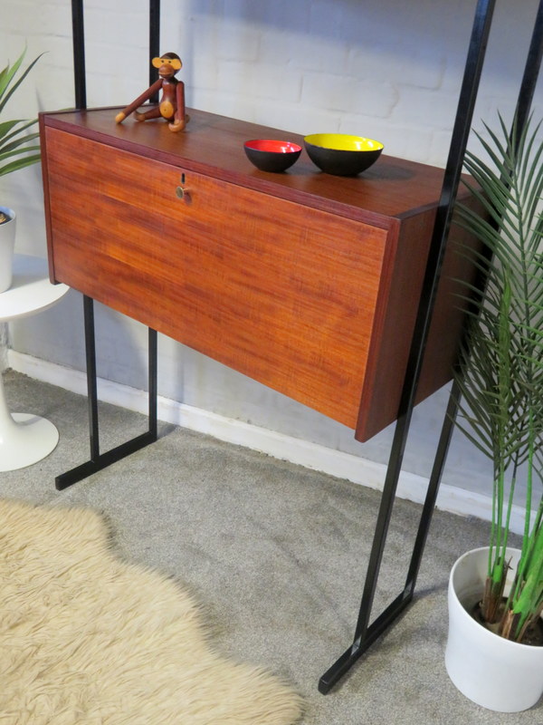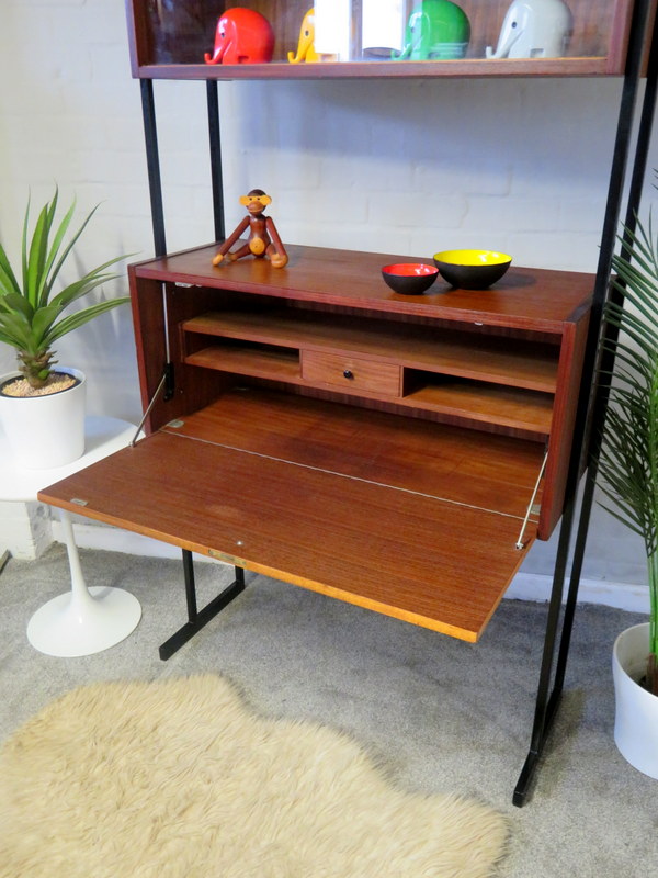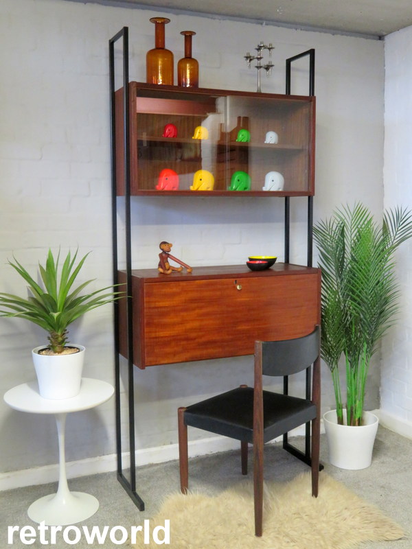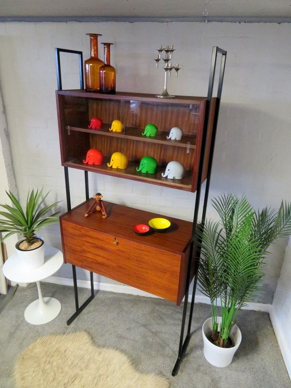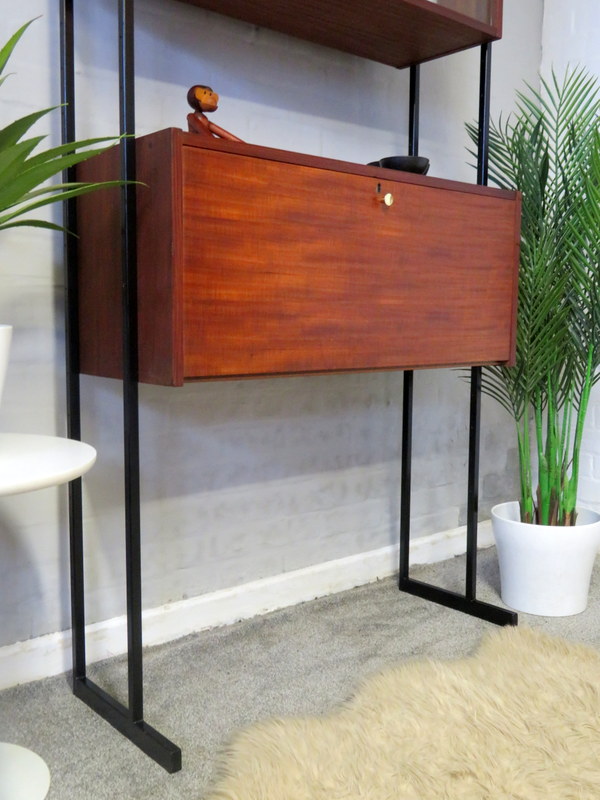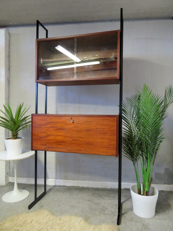 This is a great opportunity to own a LOVELY Single Bay Set of Vintage Modular Shelving that would look fantastic in a Vintage / Mid Century environment. Made by INTERFLEX this set is a Freestanding Unit so does NOT need to be fixed / screwed to a wall. Featuring x2 Stand alone Black Metal Ladders and coming with a Storage / Display Cabinet with glass sliding doors & internal shelf and a very useful Drop Down Door Bureau (with working lock & original key). Both Cabinets can be fixed at your chosen height. Each Cabinet is fixed to the Black Supports by screws that go from inside the Cabinet through to the Ladder (see last image).This lovely looking & very useful| Width | 93 cms / 3 Ft 1/2 Inches Approx. |