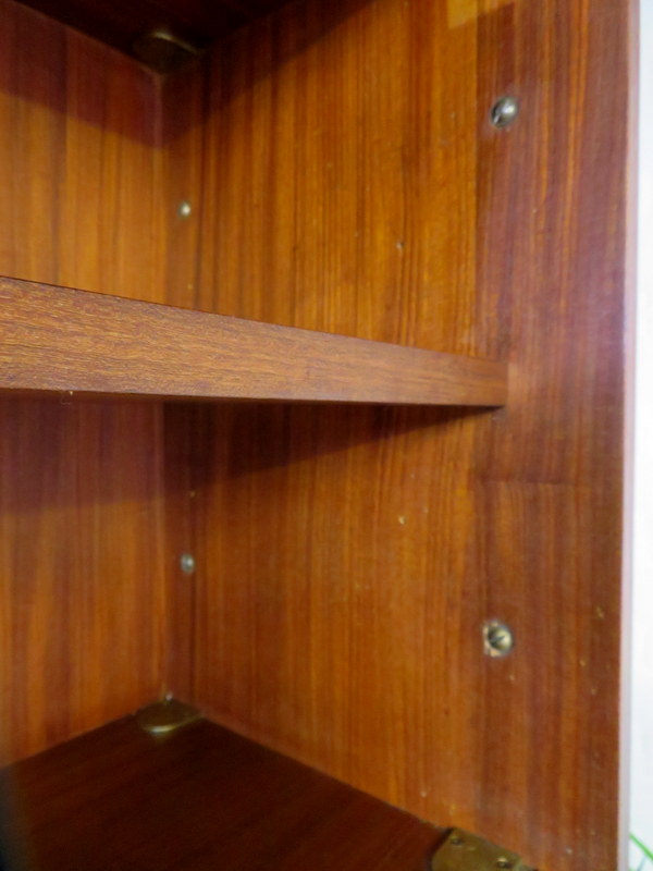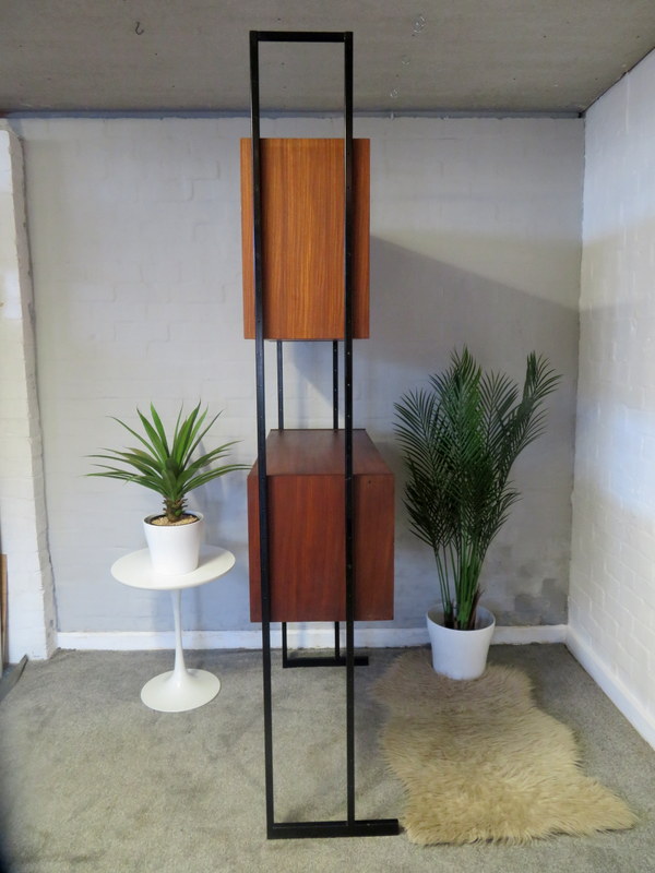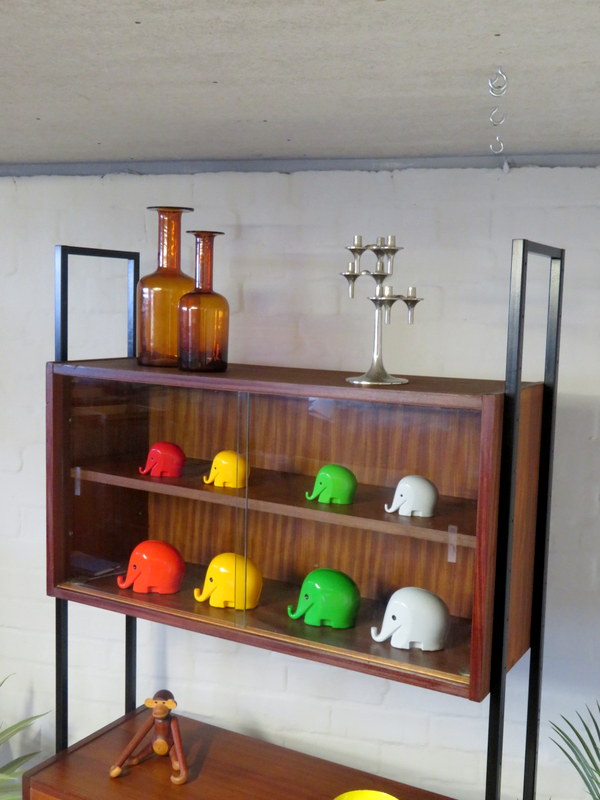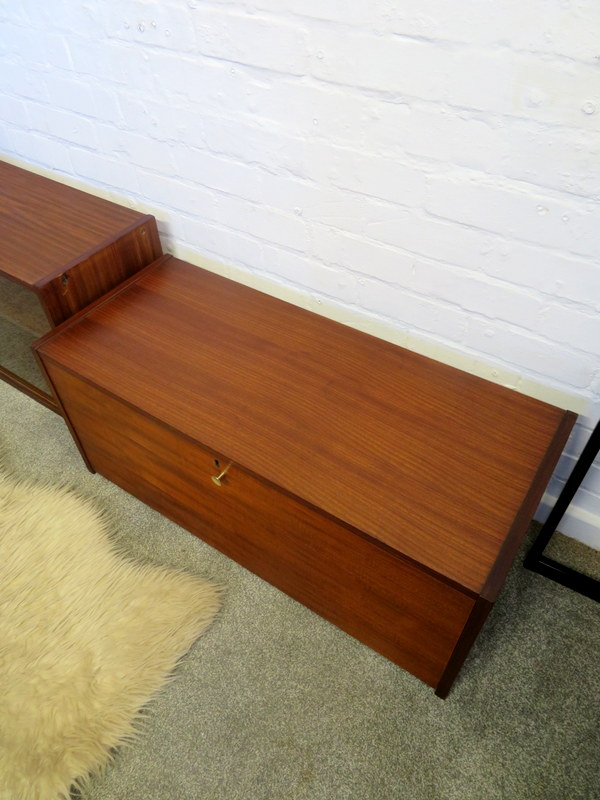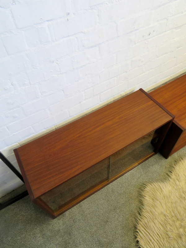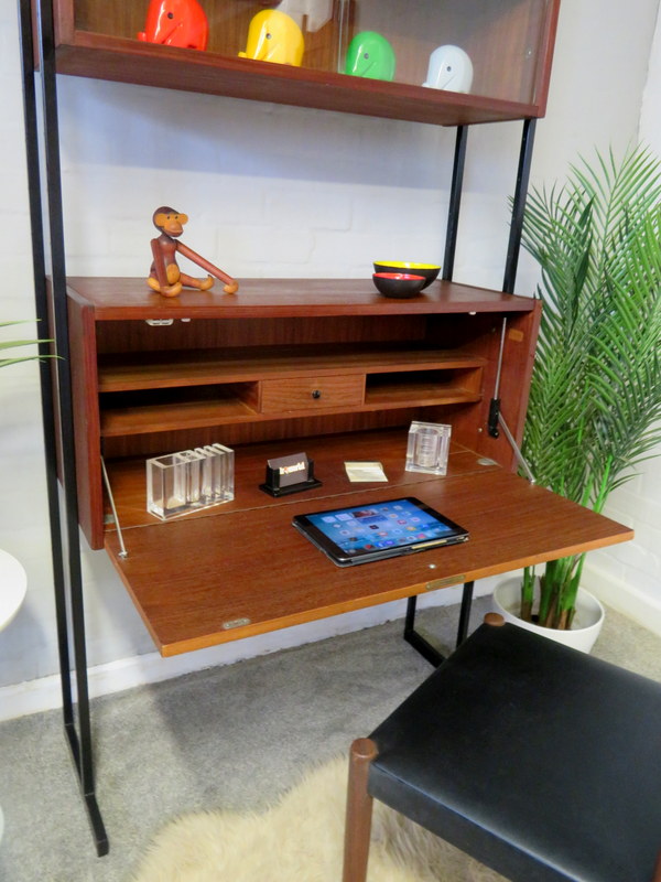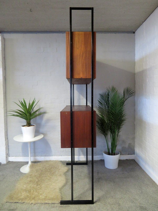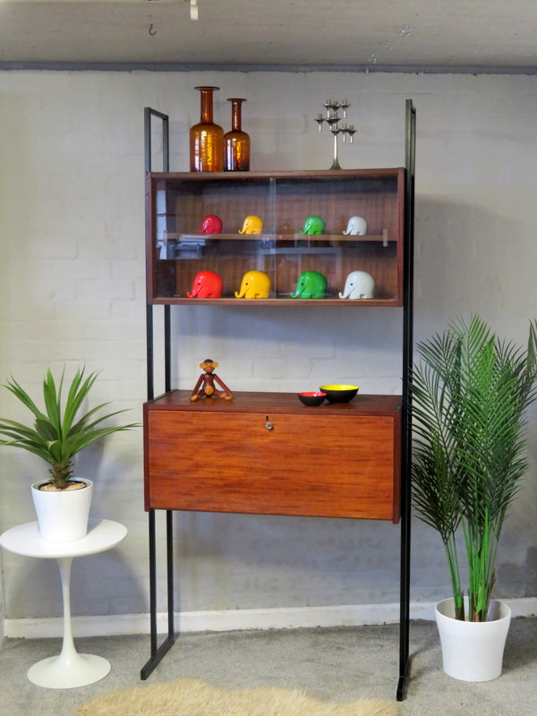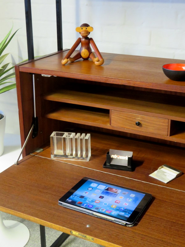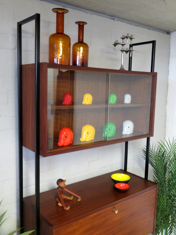 This is a great opportunity to own a LOVELY Single Bay Set of Vintage Modular Shelving that would look fantastic in a Vintage / Mid Century environment. Made by INTERFLEX this set is a Freestanding Unit so does NOT need to be fixed / screwed to a wall. Featuring x2 Stand alone Black Metal Ladders and coming with a Storage / Display Cabinet with glass sliding doors & internal shelf and a very useful Drop Down Door Bureau (with working lock & original key). Both Cabinets can be fixed at your chosen height. Each Cabinet is fixed to the Black Supports by screws that go from inside the Cabinet through to the Ladder (see last image).This lovely looking & very useful| Width | 93 cms / 3 Ft 1/2 Inches Approx. |