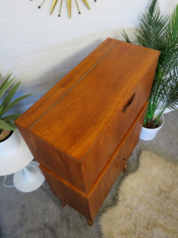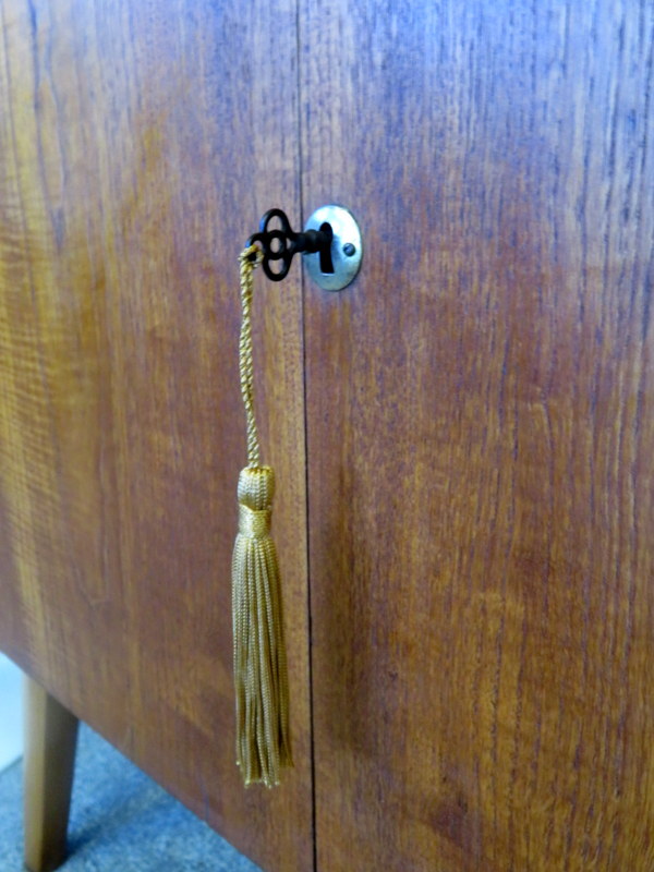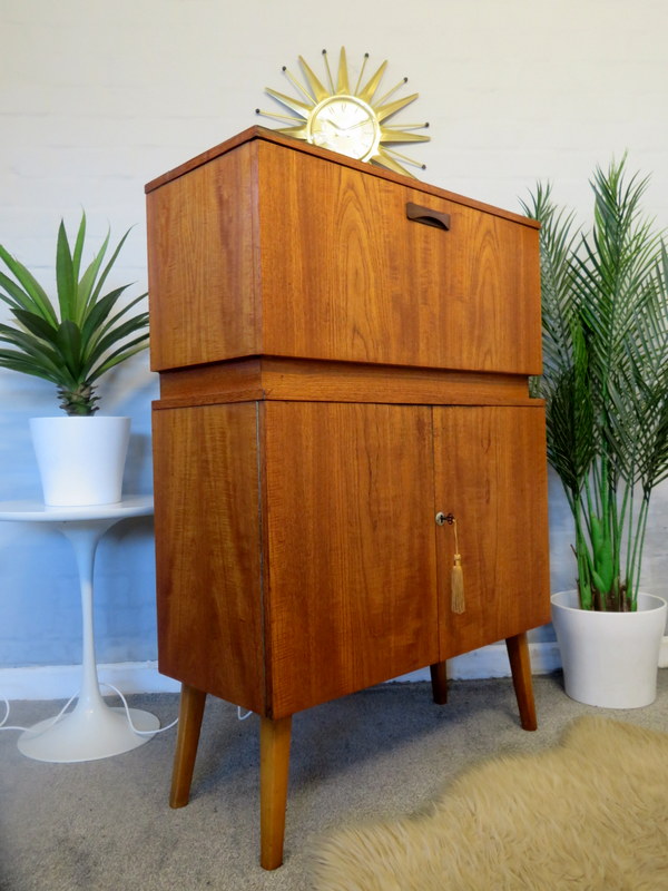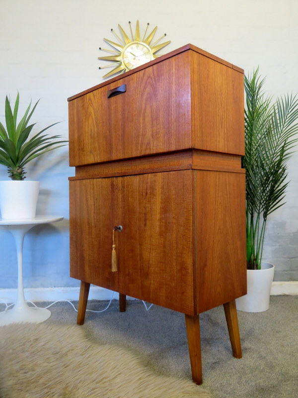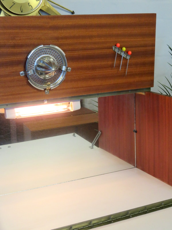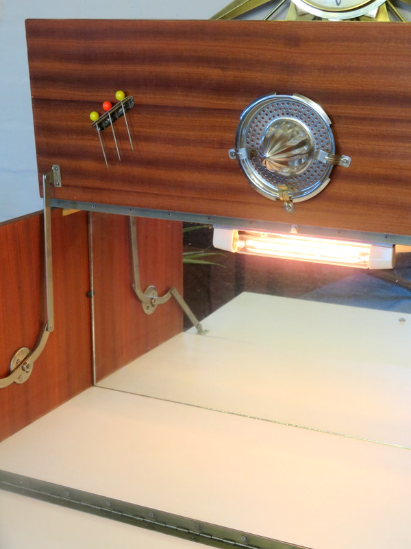 illuminated top Cocktail section. Pull down the from flap and the top flap lifts and the interior light automatically turns on and reveals the mirror, the Cocktail Sticks and the Lemon Squeezer. The Cabinet comes with modern wiring & plug* The Cabinet has plenty of storage inside the bottom doors - it comes with a working lock & key (key has a lovely Gold Tassel). The Cabinet sits upon the original legs.