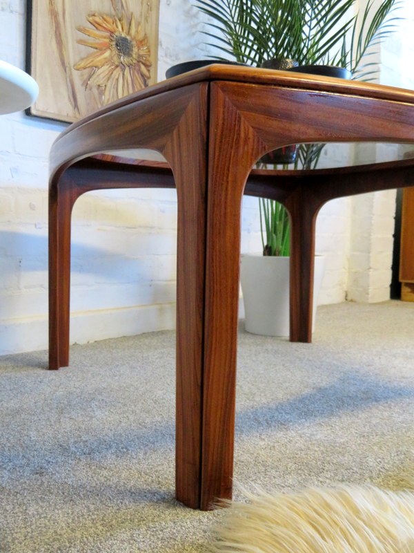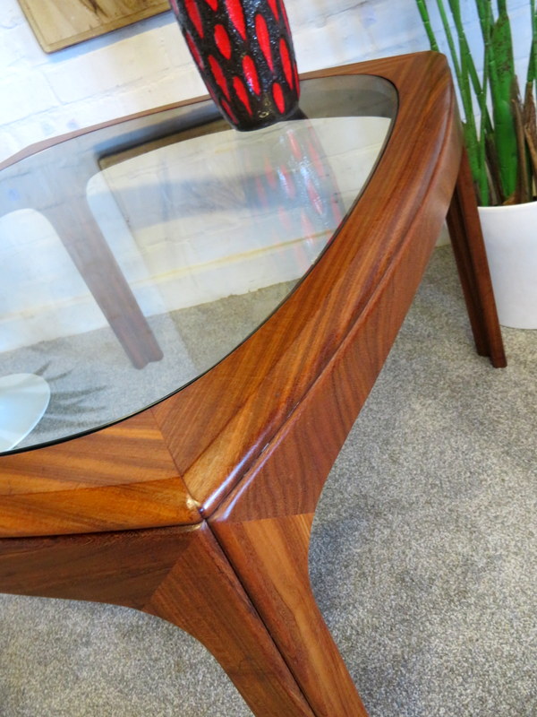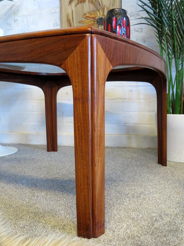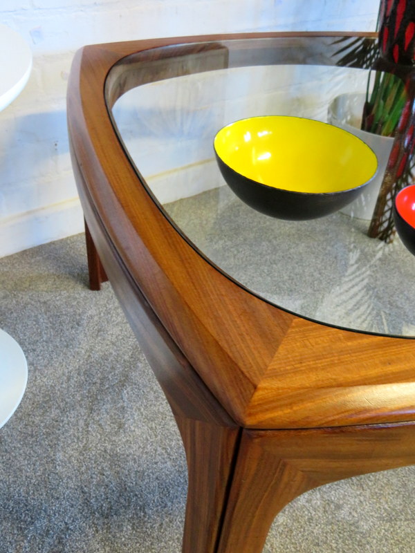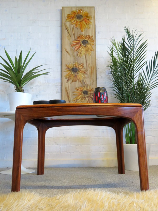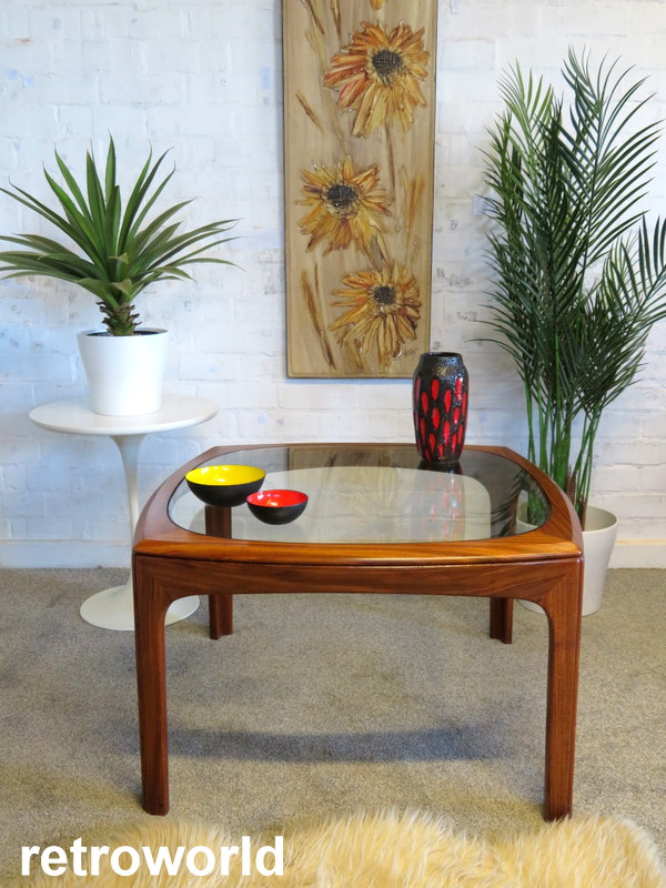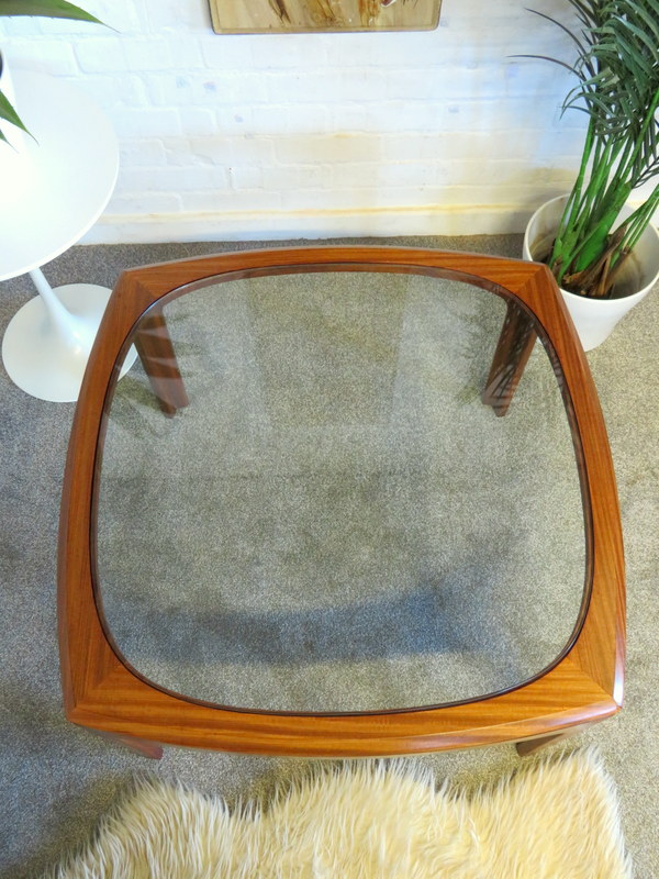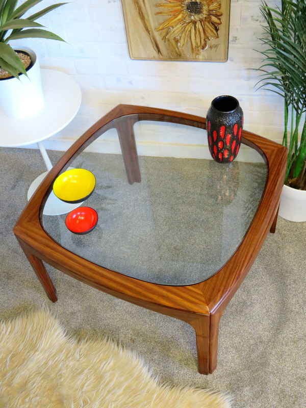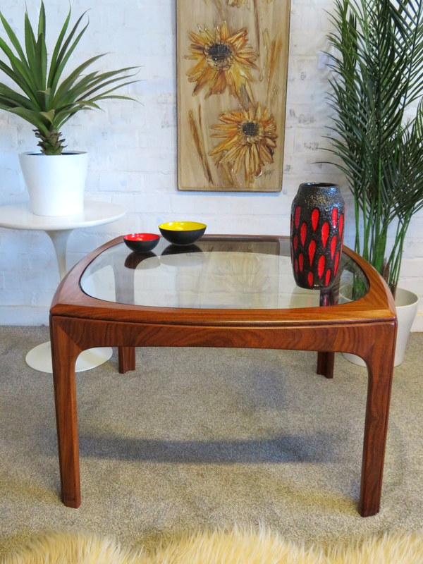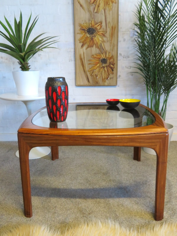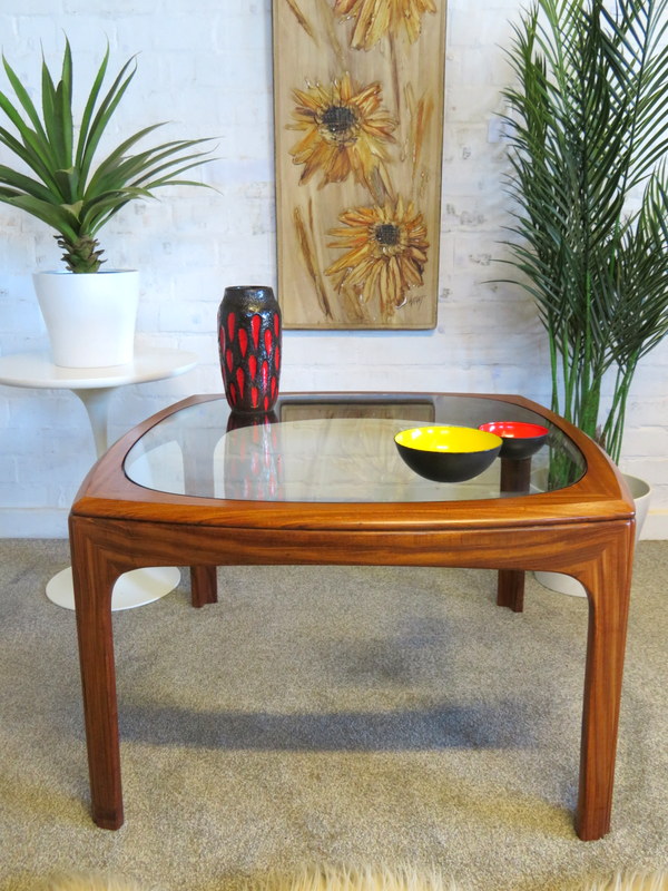 This is a great opportunity to own an GORGEOUS and HARDER to find Vintage Coffee Table made by top quality manufacturer G PLAN. With its beautiful sculpted base, original glass insert, gorgeous wood grain this BEAUTIFUL Coffee Table would look great in a Vintage / Mid Century environment.