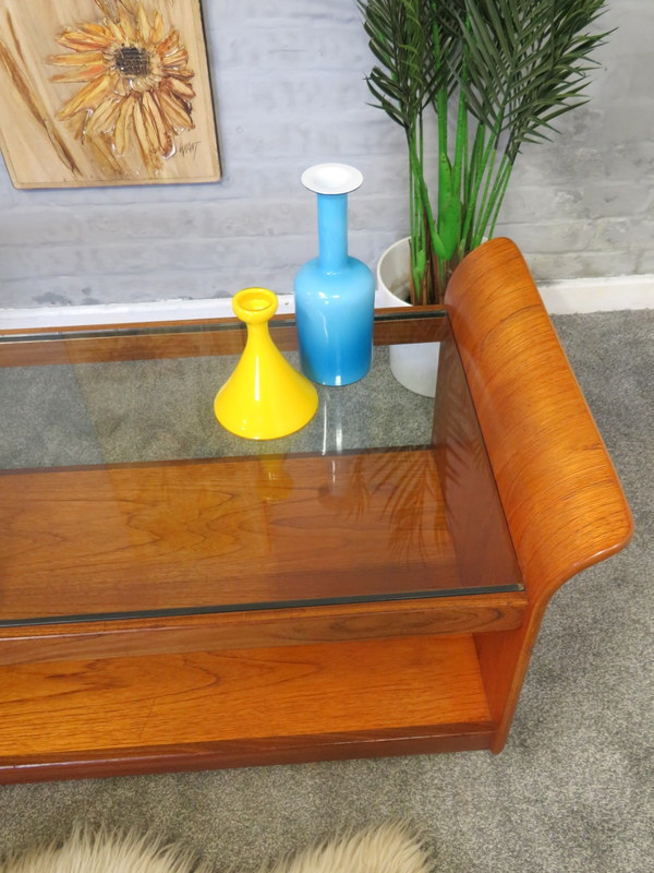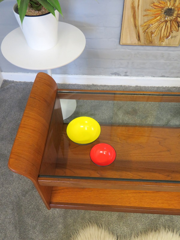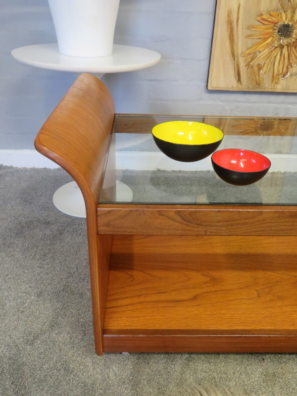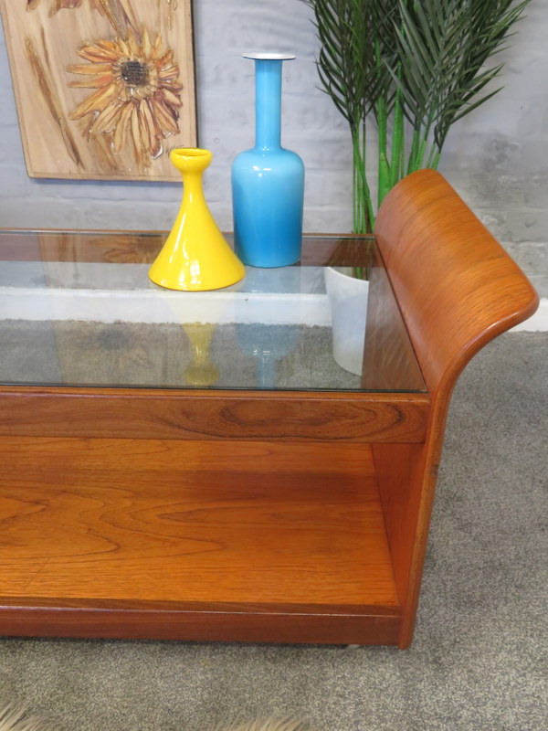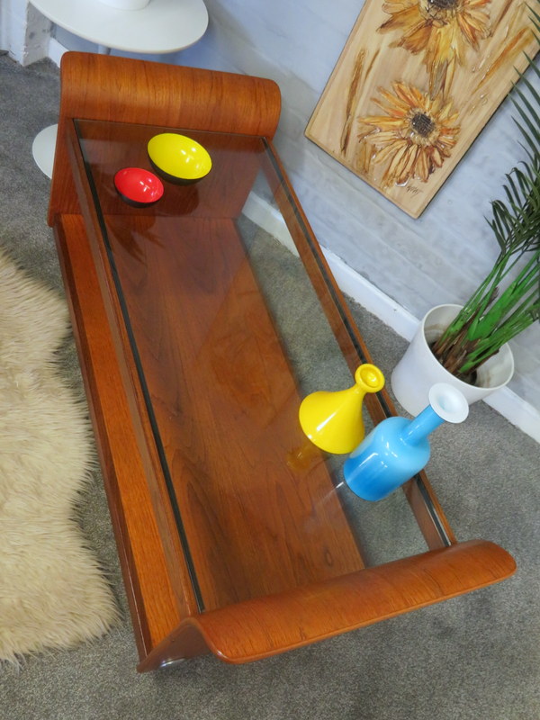 Coffee Table. With its gorgeous Tulip / curved sides, the original thick glass insert in the top, all x4 lovely chrome circular caps, the handy magazine rack underneath and sitting upon the original chrome castors this lovely Coffee Table would look great in a Vintage / Mid Century environment.